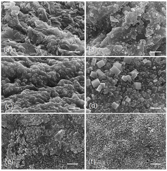 The observations show that the microstructure of the two samples of dried algae, lyophilized, and dried in the oven, were different (Figure 3a,b), as well as the respective extracts obtained at 25 °C (Figure 3c,d) and 100 °C (Figure 3e,f). In both cases, the extracts of the algae lyophilized or dried in the oven exhibit groups of cubic and parallelepiped-shaped crystals, but in the aqueous extracts of the lyophilized algae they seem to be embedded in an amorphous matrix (Figure 3c,d).
