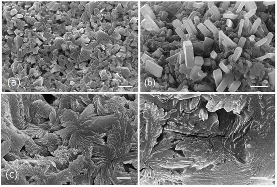 The water extract obtained from the ocean samples at 100 °C, seem to be essentially constituted by large aggregates of cubic and parallelepiped-shaped crystals of diverse sizes (Figure 4a,b), while the capsules extract obtained at the same conditions appeared as a fibrous framework formed by rosette aggregates made by irregular long-shaped particles of different sizes (Figure 4c,d).
