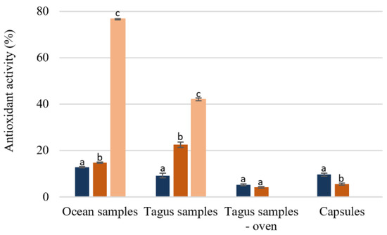Analyzing the effect of the temperature extraction on the antioxidant activity (Figure 4), the extraction at 100 °C leads to a higher activity, except for the capsules. The ocean samples extracted at 100 °C and purified by SPE was the extract with a higher antioxidant activity (76.54% ± 0.17) followed by the Tagus samples extracted with the same conditions (41.98% ± 0.55). The results present in Figure 4 demonstrate that although the antioxidant activity even in the best situation is lower than the standard like butylated hydroxytoluene (BHT), whose IC50 is 15.7 ug/mL [35,36], it would be approximately 60 ug/mL, value similar to those obtained in infusions from medicinal plants [30]. Capsules, as well as the Tagus samples dried in the oven showed a very low antioxidant activity, Figure 5.