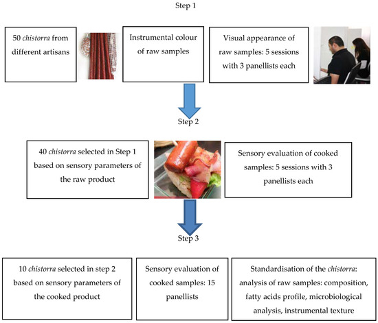 The second step consisted of the sensory evaluation of the cooked chistorras (40 samples selected at the first step). The two best-evaluated chistorras from each of the five panellist sections, were selected based on sensory parameters of the cooked products. Thus, at this second step, 10 chistorras were selected to pass on to the third and last step.