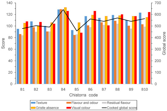 The results obtained for the samples in step 2 showed that the 10 best scored chistorras had a better texture, odour, flavour and colour (p < 0.001) and lower presence of gristle (p < 0.001), when compared to the group of non-finalist chistorras. Focusing on the ten finalist chistorras, the highest sensory score was obtained by producer B4 followed by B8 and B10 (Figure 2).