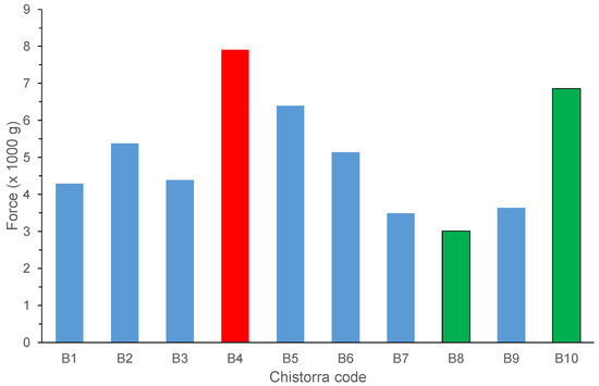 Warner Bratzler Shear Force texture results for the chistorras scored at step 3. Red bar refers to the winner chistorra; green bars, refer to the finalist ones.
