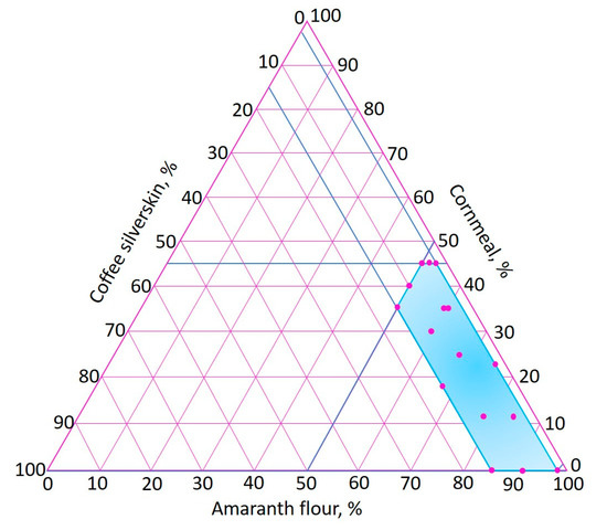 An extreme vertices mixture design [66] was used, varying the amounts of AF (50–98%), CM (0–45%) and CS (2–15%). The proposed range of CS was determined according to previous studies in which agri-food industry by-products were incorporated into extruded foods [30,31,32,33]. Figure 2 shows the experimental region of the extreme vertices mixture design, where the 16 points of the experimental runs are indicated.