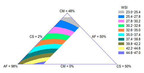 Contour plot for WSI of extruded product formulated with corn meal (CM), amaranth flour (AF) and coffee silverskin (CS).