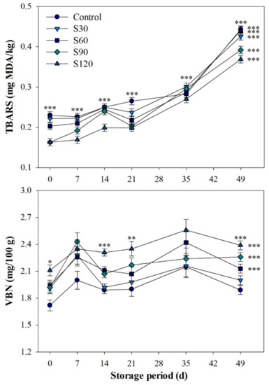Changes in TBARS and VBN concentrations among the groups during storage periods are presented in Figure 1. All SV cooked patties tended to increase TBARS values during 0–49 d of cold storage. After 14 d of storage, all patties within each group exhibited a higher TBARS value compared to that at 0 d of storage (p < 0.001), and also showed a higher value at 49 d of storage compared to 14 d of storage (p < 0.001). The control group showed higher concentrations at 0 and 49 d compared to the searing groups (p < 0.001), and the S120 group did exhibit the lowest values at 7, 14, 35, and 49 d of storage compared to the other groups (p < 0.001). No difference was observed in the VBN concentrations during storage periods within the control or S30 groups (p > 0.05). SV patties from the S90 (1.92 vs. 2.26 mg/100 g, p < 0.001) and S120 (2.11 vs. 2.39 mg/100 g, p < 0.001) groups showed higher values of VBN at 0 d compared to at 49 d. On the other hand, there was no difference between the groups at 7 and 35 d of storage (p > 0.05). Lower concentration was detected in the control group at 0 d compared to the searing groups (p < 0.05); whereas, no difference was observed at 49 d between the control and S30 groups (1.89 vs. 2.00 mg/100 g, p > 0.05).