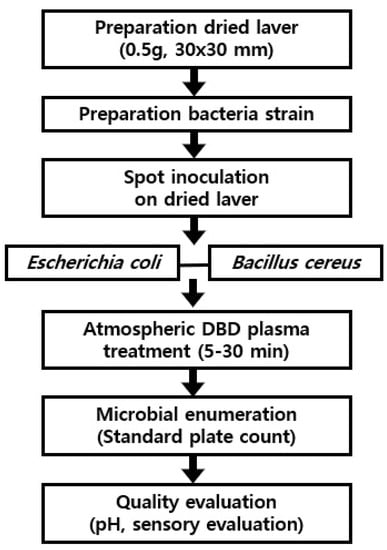 This study was conducted to investigate the effects of DBD plasma on E. coli and B. cereus as the potential microbial hazards of dried laver. The reductions of E. coli and B. cereus in the laver treated by 5–30 min of DBD plasma were 0.56–1.02 and 0.24–1.38 log CFU/g, respectively. The D-value of E. coli and B. cereus was calculated as 29.80 and 20.53 min, respectively, using the Weibull model for E. coli (R2 = 0.95) and the first-order kinetics model for B. cereus (R2 = 0.94). No changes in pH and sensory scores (p < 0.05) were observed in the laver treated with DBD plasma for 5–30 min (pH 6.20–6.21, sensory scores >6 point). Thus, these findings suggest that 30 min of atmospheric DBD plasma treatment for dried laver can reduce the microorganisms without deleterious changes in food qualities. This study also provides the application of DBD plasma as a new emerging microbial control technology for the seaweed food industry.