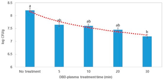 Effects of DBD-plasma treatment on E. coli in dried laver and fitted survival curves by the Weibull model. The letters a and b indicate significant differences (p < 0.05) in reduction over DBD plasma treatment time for E. coli (Duncan’s multiple range test with 5% probability).