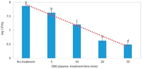 B. cereus counts were significantly (p < 0.05) reduced in the dried laver by increasing DBD plasma treatment time (5–30 min) (Figure 4). However, no significant differences (p > 0.05) in B. cereus were observed between the laver treated with DBD plasma for 20 min and the laver treated with DBD plasma for 30 min. The overall average counts of B. cereus with 5, 10, 20, and 30 min of DBD plasma were 7.63 (reduction of 0.24 log, 42.46%), 7.21 (reduction of 0.66 log, 78.12%), 6.63 (reduction of 1.24 log, 92.25%), and 6.49 (reduction of 1.38 log, 95.83%) CFU/g as compared with the initial B. cereus counts of 7.87 log CFU/g, respectively. Based on the B. cereus survival curves in the dried laver, the D-values were calculated using first-order kinetics (Table 1). The R2 values (0.94) indicated that this log-linear kinetic model for B. cereus was a suitable fit to determine the slopes and D-values.