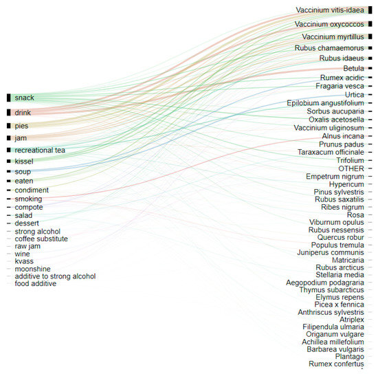 The most popular food categories were snacks (294 DUR), drinks (245 DUR), pies (194), jam (172), recreational tea (167 DUR), and kissel (122 DUR) (Figure 2). Berries are used for cooking most types of dishes. Recreational teas are the only relatively popular group of food that uses non-berry plants. Soups include only two plants—Rumex acidic and Urtica—which represent the first sources of vitamins in spring. Taste additives are the least popular food products.
