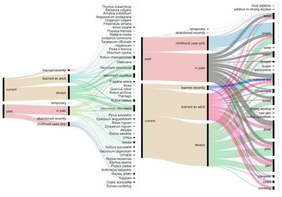 The tradition of adding wild greens to soups represents mostly a past use. The category of recreational teas is the most fluid due to opposing tendencies: there is no need to substitute currently widely available, commercially produced tea, yet at the same time users stick to the herbal infusions known since childhood and widen their repertoires by adding new wild species like Epilobium angustifolium. Strong alcohol is currently made by very few people, and only two interviewees mentioned it in connection with the past.