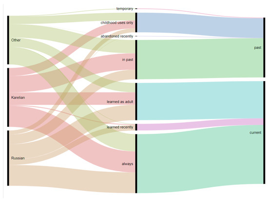 The prospects of revitalization of the Karelian language have recently been described as bleak [29], but also encouraging based on the teaching of Karelian at schools and pre-schools [35,36]. For example, in Vedlozero, there is the so-called “language nest”, a group of children of pre-school age organized as a kindergarten in the Karelian language, which has been open since 2017 [37].