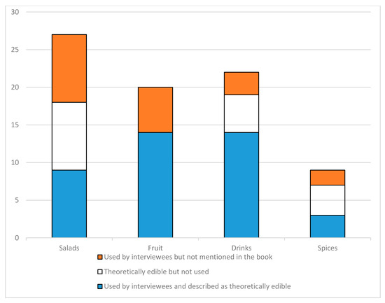 Besides being directly eaten, there are a number of plants that are used in cooking but their “role” in the final product is only to add taste. The largest such group consists of trees and bushes used for smoking meat and fish, with the most used taxa being Alnus incana and Populus tremula. The second group consists of spices. Most of the population of Karelia never used spices bought from shops as they were very expensive and thus available only to wealthy people: “Seasonings, besides pepper and onion, are unknown, as is vinegar. Tea is drunk by the rich on Sundays” [14]. This tradition turned out to be so sustainable that even during Soviet times, when seasoning dishes became possible, many housewives did without them. The exception being fresh fish soup. In fact, only bay leaves and black pepper were discussed in the abovementioned book [21]. Perhaps this habit of not using seasoning has also influenced the minimalism in spice use today—the spicy herbs mentioned by our respondents were not very numerous.