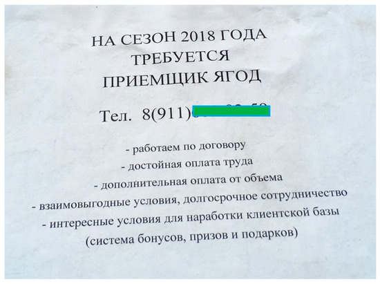 An advertisement about a berry receiving inspector job vacancy for 2018 season, Kalevala. Translation: ‘For the season of 2018 a berry receiving inspector job position is open. Tel. xxx-xx-xx. -job contract, -decent salary; -additional payment in function of volume; -mutually beneficial conditions, long-term collaboration; -attractive conditions for the customer base (a system of bonuses, prizes and gifts)’.