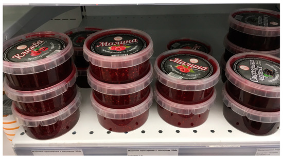 ‘Iagoda Karelii’ mentioned by the respondent is the first company in Russia to completely process forest berries, from cleaning and sorting to producing fillings, jams, and confitures [82]. Recently, direct investment from Swedish, Finnish and Norwegian companies has become a stimulus for the development of procurement in Karelia. This is due to the proximity of the region to the western borders of Russia and relatively cheap Russian raw materials market. In Karelia, there are about 40 companies collecting wild plants and delivering them to the countries of Northern Europe. All of them work under the condition of full funding from Western partners. Still, the processing of wild-grown berries is not developed in the region: most operators in this market collect berries and export them “as is” [83]. In shops, one can buy jams and other products made from the same berries which have been harvested for centuries (Figure 10).