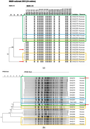 - De Rauw, K.; Denayer, S.; Piérard, D. Rapid Molecular Typing of Shiga Toxin-Producing E.coli (STEC) O157:H7 during an Outbreak in Belgium by IS629-Printing. In Proceedings of the 10th International Meeting on Microbial Epidemiological Markers (IMMEM X), Paris, France, 2–5 October 2013. [Google Scholar]