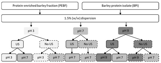 Schematic presentation of ultrasound and pH-shifting treatments performed for the protein-enriched barley fraction (PEBF) and barley protein isolate (BPI). US; ultrasound treatment.