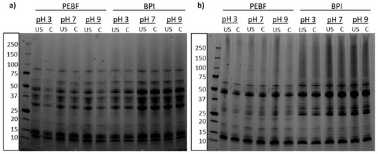 SDS-PAGE analysis of PEBF and BPI revealed modest changes in the protein profiles of the two ingredients (Figure 2a, control samples at pH 7). B and C hordeins form the most abundant protein classes in barley and were identified at 30–50 kDa [5,39] and 55–70 kDa [40], respectively, in both PEBF and BPI. However, slightly more intense bands were observed from BPI suggesting enrichment of those proteins into BPI during wet extraction of proteins. In addition to B and C hordeins, presence of D hordeins at approximately 85–90 kDa and low molecular weight or A hordeins at below 15 kDa, were identified [5,39]. Gamma globulin subunits are known to size 50, 40, 25 and 20 kDa [41] and those subunits were detected in both samples (Figure 2a). Non-reducing SDS-PAGE revealed some differences between PEBF and BPI as the polypeptide at around 25 kDa was not present in BPI whereas larger polypeptides at 75–150 kDa were more abundant in BPI than in PEBF.