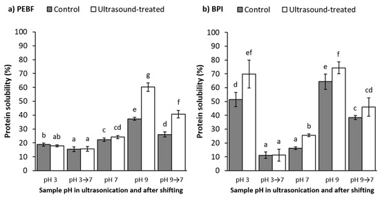 Ultrasound treatment almost doubled the protein solubility of PEBF (from 37.3 to 60.3%) at alkaline pH. On the other hand, no impact on the protein solubility of PEBF was observed at neutral and acidic pH. For BPI, ultrasonication significantly (p < 0.05) increased the protein solubility at all three pH values (Figure 3b). Similar increases in protein solubility after ultrasonication have also been observed for various plant proteins. Ultrasound treatment increased solubility of black bean protein at pH 7 from 47 to 51% [21], pea protein at pH 7 from 8 to 56% [20], millet protein at pH 7 from 67 up to 95% [22], faba bean protein at pH 7.4 from 20 to 35% [23] and soy protein at pH 8 from 10 up to 55% [19]. It has been suggested that the improved protein solubility after ultrasound treatment may result from opening and partial unfolding of the protein structure due to mechanical impact of the forces such as shear and microstreaming currents created by cavitation [45,46]. This may cause for example breakage of non-covalent interactions such as hydrophobic and electrostatic interactions and hydrogen bonding as well as improved interactions between protein and water molecules [22,23]. Moreover, the impact may be fortified by the impact of pH on protein structure during or after ultrasound treatment. However, contradictory data is available concerning impact of ultrasonication on the secondary structure of proteins. Ultrasound treatment in general has reduced the amount of alpha-helixes and increased the amount of beta-sheets for various plant proteins [19,21,23,46] but also some studies reported that it did not alter the secondary structure at all, but influenced more the tertiary structure [26,47]. As mentioned earlier, the impact on protein structure and functionality is varying depending on the ultrasonic intensity applied and the plant matrix.
