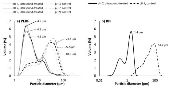 Impact of ultrasound treatment and pH on particle size distribution of (a) protein-enriched barley fraction (PEBF) and (b) barley protein isolate (BPI) at ultrasound-treatment pH. Median particle size of each sample is indicated next to the size distribution curve.