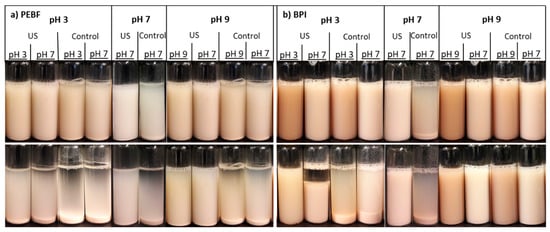 Ultrasound-treated PEBF exhibited improved stability at pH 3 after short (10 min) observation time when compared to the control sample at pH 3. However, the impact of ultrasound treatment was less visible after longer (180 min) time of standing. As no impact on protein solubility (Figure 3a) was observed after ultrasound treatment at pH 3 for PEBF, the slightly improved dispersion stability against sedimentation is not suggested to be due to effects of ultrasonication on protein solubility but due to the reduced particle size. At pH 7, the PEBF showed improved stability against sedimentation after ultrasound treatment, again in-line with observed reduction in particle size. At pH 9, the ultrasound treatment of PEBF improved both short- and long-term stabilities when compared to the non-ultrasonicated control. In that case, improved stability could be associated with improved protein solubility as well as with decreased particle size, as has also been discussed related to pea and soy protein isolates [25]. According to SDS-PAGE results, no proteolysis was observed, which indicated that the improved solubility and further improved colloidal stability resulted mainly from physical factors such as particle size reduction or structural changes such as possible modification of tertiary structure rather than protein hydrolysis. Decreasing particle size has been shown to improve stability of cereal-based ingredients in liquid matrices against gravitational sedimentation [37,48,49].