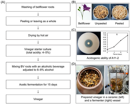 The vinegar starter culture was prepared by mixing 10 mL of an acetic bacterial suspension (total acidity: 4–5%, v/v) that was cultured from the abovementioned maintenance broth with 90 mL of a previously fermented alcoholic beverage (14.06% alcohol, pH 4.05, 0.43% acidity) with an alcohol concentration adjusted at 6–8% (pH 3.87, 0.28% acidity within alcohol and water mixtures). This mixture was further mixed with 900 mL of alcohol adjusted at 6–8% conc. and fermented at 30 °C to increase the starter culture amount to 1 L: this cultured vinegar starter was used to produce bellflower vinegar (BV).