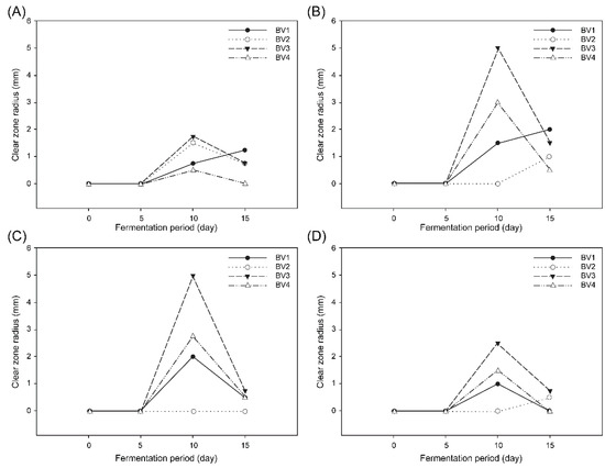 Four pathogenic strains were purchased from the Korean Collection for Type Cultures (KCTC, KACC, and ATCC (Virginia, USA): Escherichia coli KCTC 1309, Salmonella Typhimurium KCTC 41028, Bacillus cereus KACC 10004, and Staphylococcus aureus subsp. aureus ATCC 6538. All strains were grown in tryptic soy broth (Difco, Detroit, MI, USA) and incubated overnight at 30 °C for 24 h before use. All inocula were adjusted to an optical density of 0.5 at 660 nm. A 100 μL aliquot of each strain was evenly swabbed onto a tryptic soy agar plate that was previously dried and stored at 37 °C, and then 8 mm paper discs (Advantec, Toyo Roshi Kaisha Ltd., Tokyo, Japan) were placed onto the plates. Then, 50 μL of each BV from different fermentation durations was added to the paper discs. Plates were incubated at 30 °C for 18 h, and the inhibition zones surrounding the samples were measured. All experiments were repeated at least three times.