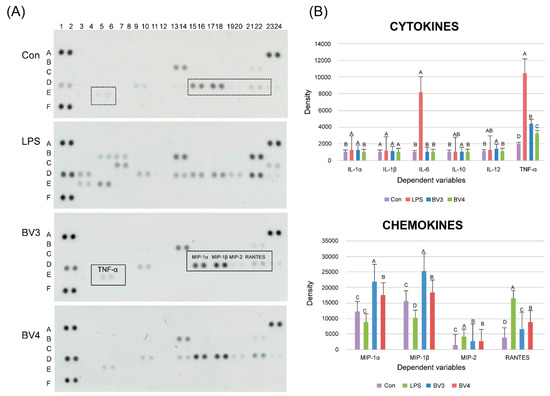 Figure 4), using the Proteome Profiler Mouse Cytokine Array Kit (R & D Systems, Bio-Techne). The most prominent effect observed in the immunomodulation of macrophage cells was the significant increase in IL-1α and TNF-α, which are known to be secreted by macrophages upon stimulation by LPS. In addition, BV3 caused a higher expression of cytokines than BV4 did and significantly increased the production of IL-1α and TNF-α in RAW mouse macrophage cells, cytokines that have been reported to have antitumor properties. Previous reports have described that several Th1-promoting cytokines, such as TNF-α and IL-12, can enhance antitumor immunity [