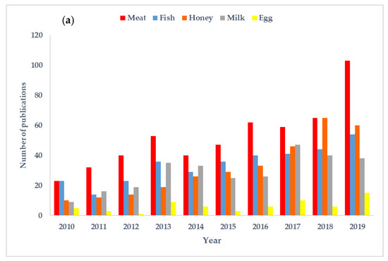 Fraud in animal origin products can take many forms, including mislabeling of the provenance (geographical or botanical origin), species substitution, discrepancies in the production method and farming or breading technique, addition of non-declared substances, as well as fraudulent treatments and non-declaration of processes, such as previous freezing, irradiation, and microwave heating (Figure 1). To support this review and obtain the research published in the last few years on the authenticity of food products of animal origin, Scopus database was queried in May 2020, using the keyword “authenticity” or “authentication” and the different categories of animal origin food products. It can be noticed that a huge amount of studies dealing with authenticity and detection of fraud in fish, meat, milk, honey, and eggs has been published in recent years; the number of published works increased from 530 between 2010 and 2014 to 1000 between 2015 and 2019 (Figure 2a).