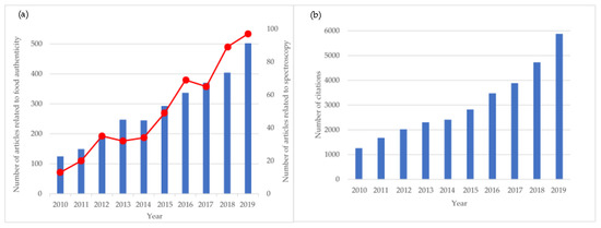 Numbers of published works related to food authenticity (blue bars) and use of spectroscopic techniques in relation to food authenticity (red line) (a). Numbers of citations including the words authenticity or authentication and spectroscopy (b) since 2010. Data obtained from Scopus database on 25 May 2020.