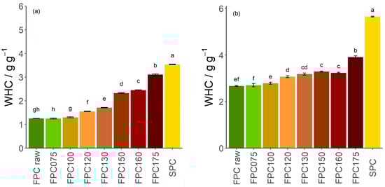 The overall WHC of non-dry-heated FPC was 1.25 g g−1, less than half of the value of SPC (3.53 g g−1, Figure 1a). While dry-heating at 75 °C and 100 °C did not alter the overall WHC, dry heating at higher temperatures led to a significant increase in WHC. Substantial increases are seen for samples treated at 150 °C and 175 °C, reaching values of 3.10 g g−1.