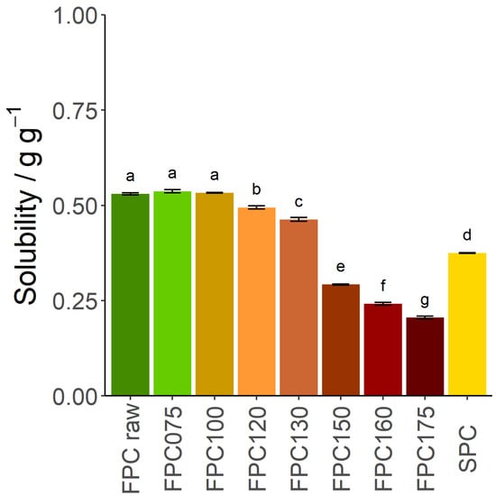 To understand this change in WHC, the solubility of FPC was investigated. The amount of soluble material was initially 0.53 g g−1 for the non-dry-heated sample, remaining unchanged after dry-heating at 75 °C and 100 °C, and only slightly decreasing after dry-heating at 120 °C and 130 °C. However, after dry-heating at 150 °C or more, it decreased to 0.29 g g−1, lower than the solubility of SPC (Figure 2). The WHC of the insoluble fraction only increased by 23.2% after dry-heating at 150 °C (Figure 1b), whereas the WHC of the overall dry matter increased by 86.4%. As the soluble protein fraction has no WHC, the increase of the insoluble protein fraction is the main cause of the increase in WHC of FPC dry-heated at 150 °C. At 175 °C, the change in overall WHC cannot be explained by insolubility only.