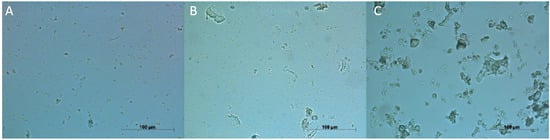 To visualize protein aggregation, dry-heated and non-dry-heated samples were observed using light microscopy. Figure 3 shows a 40× magnification of the non-dry-heated (A) and dry-heated samples at 100 °C (B) and 150 °C (C). For the non-dry-heated sample, black spots below 10 μm were observed, with no particles above 20 μm. After dry-heating at 100 °C and 150 °C, the number of larger aggregates increased, with sizes above 20 μm. Dry-heating at 100 °C resulted in fewer particles in the sample, with multiple particles below 10 μm. Samples dry-heated at 150 °C contained more particles above 20 μm and 50 μm, while the small particles that were observed in the first two samples were hardly found. Therefore, it is an indication that dry-heating at 100 °C and 150 °C led to aggregation of particles, and the effect was stronger at the higher temperature.