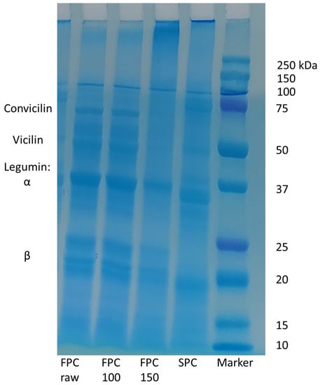 SDS-PAGE of non-dry-heated and dry-heated FPC. SPC is shown as a reference. Non-dry-heated and dry-heated at 100 °C FPC showed bands for convicilin, vicilin, α-legumin, and β-legumin. FPC dry-heated at 150 °C showed the legumin bands less pronounced, while the vicilin and convicilin bands were not detectable. Instead, indistinguishable bands larger than 250 kDa appeared. For soy, the subunits for glycinin and β-conglycinin were visible.