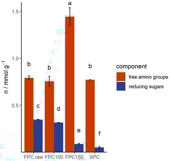 Number of reducing sugars and free amino groups in mmol g−1 dry matter of dry-heated and non-dry-heated FPC and commercial SPC. n = 3. The number of reducing sugars decreased with increasing dry-heating temperature, while the number of free amino groups increased after dry-heating at 150 °C. SPC is shown as an industry reference.