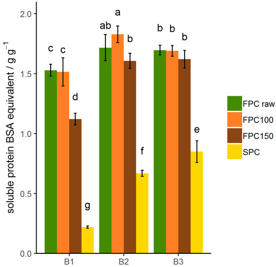 Solubility of protein dry-heated and non-dry-heated FPC as well as commercial SPC after disrupting electrostatic interactions (B1), noncovalent interactions (hydrophobic and electrostatic interactions and hydrogen bonds) (B2), and covalent and noncovalent interactions (B3). n = 9. Solubility is expressed as BSA equivalent per gram FPC or SPC. Significant differences are indicated by different lowercase characters (p < 0.01). Samples dry-heated at 150 °C showed a significant difference in solubility in B1 compared to non-dry-heated FPC. Solubility of dry-heated and non-dry-heated FPC increased from B1 to B2, but not from B2 to B3. Solubility of SPC increased from B1 over B2 to B3.