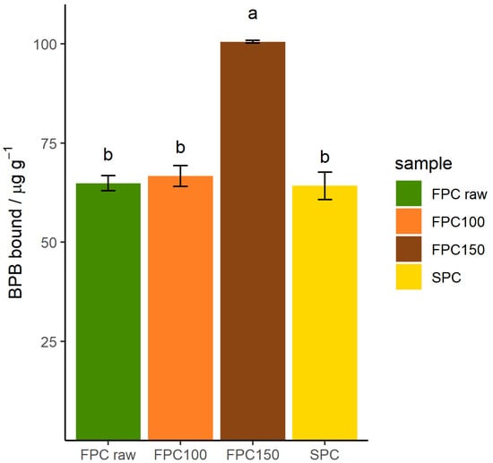 Additionally, hydrophobicity of insoluble particles was determined by the amount of BPB bound. As can be seen in Figure 7, dry-heating FPC at 100 °C did not affect the amount of BPB bound and therefore hydrophobicity. SPC bound the same amount of BPB as non-dry-heated FPC, coincidentally. However, FPC dry-heated at 150 °C bound 55% more BPB than non-dry-heated FPC, showing that the treatment increased the hydrophobicity of the insoluble fraction. This suggests that the hydrophobic sites on the inside of the protein were exposed by (partial) denaturation.