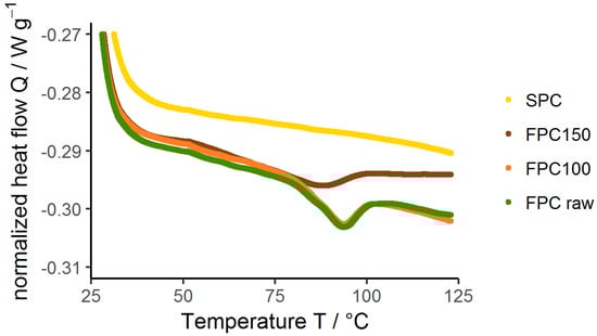 Thermograms of 0.15 g g−1 dispersions of dry-heated and non-dry-heated FPC as well as commercial SPC, produced with Differential Scanning Calorimetry (DSC). A ramp of 5 °C was used and each sample was measured in two cycles. The second cycles did not show any peaks for any sample.