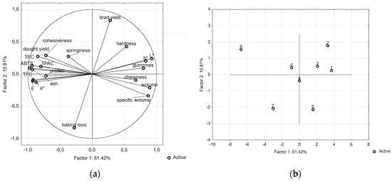 The analytical data obtained were statistically processed using cluster analysis and principal components analysis (PCA). The relationships between the input variables and the main components are shown in Figure 1a. This projection shows the distribution of the characteristics of particular analyzed parameters on the plane formed by two selected factors. PCA explains 83.73% of the total variability, with the first and second factors explaining 64.98% and 18.75% of the intergroup variances, respectively. The analysis of the presented distribution of the variables allows their division into two major groups. The first focuses on the parameters related to the texture of the bread crumb and its specific volume. The second group includes the parameters indicating mainly nutritional value, antioxidant properties and the color of the crumb of the bread. The arrangement of both parameter groups in close proximity to the circle indicates that a large part of the information contained in the input variable is carried by the main components. The arrangement of variables from the first and second category in relation to each other indicates their mutual negative correlation. This is confirmed by the Pearson correlation coefficients determined for each parameter.