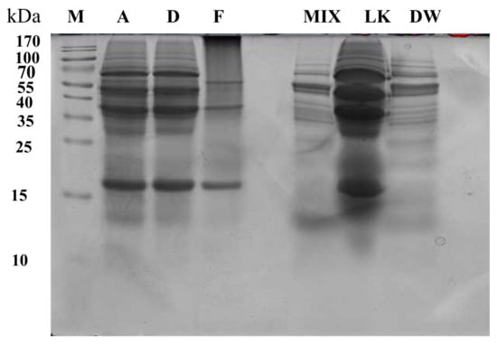 Reduced SDS-PAGE protein profile of lupin-enriched pasta samples and raw materials; M, pre-stained molecular marker; A, D, and F lupin-based pasta samples; Mix, LK: lupin kernel, and DW: durum wheat. Each sample (10 μL) was added to 10 μL of loading buffer, loading 20 μL for each well.