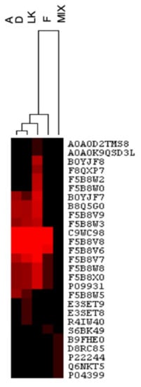 The subsequent quantitative evaluation was focused only on the proteins belonging to L. angustifolius. With the aim of highlighting the similarities between the pasta samples and the raw materials, it was decided to use HCA, which allows the presentation of cluster results in a dendrogram, where the similarity among the samples is shown by a smaller distance at which they join in a single cluster. By plotting −10LgP for each identified protein across the samples, the heatmap reported in Figure 2 clearly shows the correlation in terms of composition existing between sample A and D, which form a very narrow cluster. Both are then correlated with LK, whereas sample F and Mix fall at a wider distance, indicating a very different protein composition in respect to LK.
