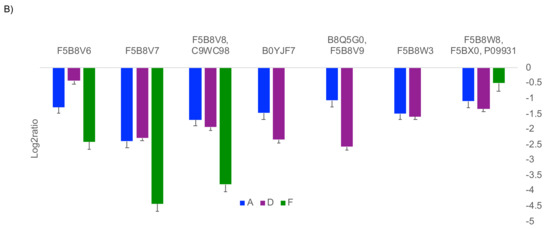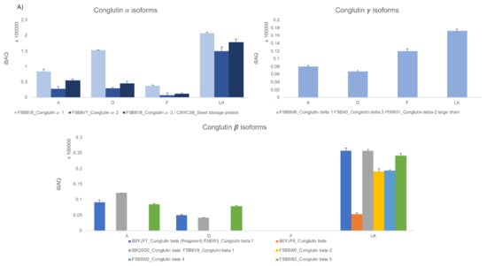 (A) iBAQ values of α, β, and δ-conglutin isoforms in samples A, D, F, and LK. (B) The log2 fold-changes of the protein levels in A, D, and F versus raw lupin flour (LK).