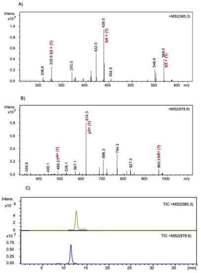 Electrospray ionization-tandem mass spectrometry spectra of [M + H]+ ions of (A) PNNIQ and (B) NIHKRTPL, respectively; (C) Total ion chromatograms (TIC) of PNNIQ (m/z 585.23) and NIHKRTPL (m/z 978.6).