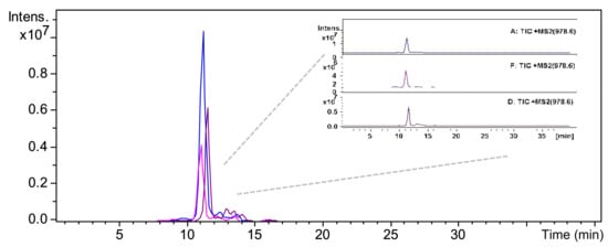 The developed approach was then applied to the lupin-enriched pasta samples. Exemplary extracted ion chromatograms of NIHKRTPL in A, D, and F samples are shown in Figure 5. The amounts of γ-conglutin detected in A, D, and F samples, obtained by interpolating the signal of the targeted peptide over the calibration curve, are reported in Table 2. The highest γ-conglutin concentration was found in pasta sample A, containing 2.25 mg/g of γ-conglutin/pasta, followed by samples D (2.16 mg/g), and F (0.57 mg/g). Again, the fibers of samples F impaired the γ-conglutin detection. These results are in line with those reported in other commercial food products [15].