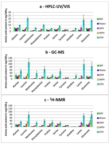 Hence, nearly no significant differences were found for the FAA contents of GPH and WPH related to the REF. Only the content of free lysine (1H-NMR, from 5.26 mg/100 g ± 0.45 mg/100 g (REF) to 26.9 mg/100 g ± 3.37 mg/100 g) for GPH, as well as the free methionine (HPLC-UV/VIS) and free leucine contents (1H-NMR) for WPH showed significant differences (Supplementary Table S5).