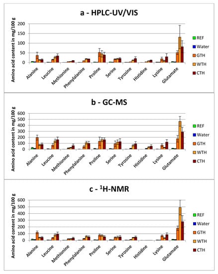 All the total hydrolyzed proteins (GTH, WTH, CTH) showed a hydrolyzation degree of 100% and were therefore only composed of AA. As expected, the FAA contents of all hydrolysate-treated samples were increased dramatically compared to the REF (Figure 2). The analysis with HPLC-UV/VIS revealed two significant and seven highly significant increases of FAA contents for GTH, eight highly significant increased FAA contents for WTH and nine rises of the amounts of FAA for CTH (p < 0.001). For example, the content of proline changed from 2.56 mg/100 g ± 0.42 mg/100 g (REF) to 52.5 mg/100 g ± 20.4 mg/100 g (GTH), 44.9 mg/100 g ± 16.8 mg/100 g (WTH) and 39.2 mg/100 g ± 13.8 mg/100 g (CTH), respectively. With GC-MS, only highly significant changes were found: for GTH seven, for WTH nine and for CTH all ten FAA contents were increased. As for HPLC-UV/VIS, the proline content was raised obviously: from 10.0 mg/100 g ± 5.81 mg/100 g to 134 mg/100 g ± 71.4 mg/100 g (GTH), 161 mg/100 g ± 31.8 mg/100 g (WTH) and 160 mg/100 g ± 30.5 mg/100 g (CTH), respectively. The same results were also found for the 1H-NMR analysis: one significant and eight highly significant increases for GTH (proline: from 5.06 mg/100 g ± 0.78 mg/100 g (REF) to 77.5 mg/100 g ± 16.3 mg/100 g), and nine highly significant differences for WTH (proline: 72.8 mg/100 g ± 12.1 mg/100 g) and CTH (proline: 53.8 mg/100 g ± 16.1 mg/100 g). Therefore, only tyrosine (GTH), alanine and lysine (WTH) as well as alanine (CTH) showed no significant differences determined by HPLC-UV/VIS. For the GC-MS-method, only methionine, tyrosine, histidine (GTH) and lysine (WTH) were not significantly different. The analysis by 1H-NMR revealed also nearly exclusive significant differences with only few exceptions (tyrosine, histidine for GTH, histidine for WTH and CTH).