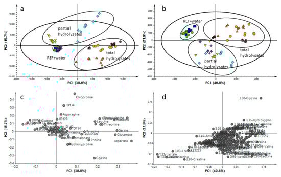 The score (a,b) and the loading (c,d) plots of all data of the principal component analysis (PCA) based on the metabolic fingerprint from adulated turkey breast meat with different protein hydrolysates (type and degrees) analyzed by GC-MS (a,c) and 1H-NMR (b,d). REF (