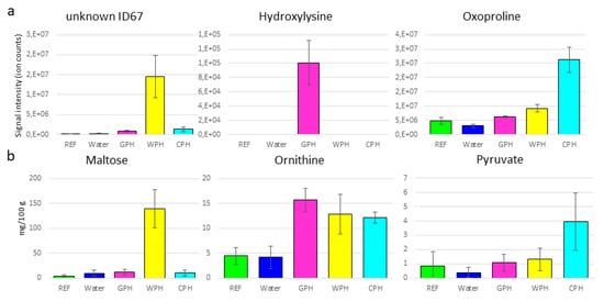 A closer look at the loading plots from the PCA models for control samples and partial hydrolysate treated samples indicated that proteinogenic amino acids play a minor role for the variation between controls (and GPH) and WPH, both having a low hydrolyzation degree (15% and 16%, respectively). The variation of CPH from controls, which was to 53% hydrolyzed, was already dominated by proteinogenic amino acids. Especially the plant-based hydrolysate contained additional sugars such as maltose (Figure 4) and hexoses like glucose, detected with both technical approaches. In addition, higher levels of glycerol were detected in WPH. As mentioned above, future studies will have to elucidate to which extent different sugars are present in plant-based protein extracts used for hydrolysis. With the animal-based protein hydrolysates, GPH and CPH, the contents of ornithine (Figure 4) were increased as detected with 1H-NMR and GC-MS. A low level of levulinic acid and 3-MCPD was observed in CPH treated breast muscle, which might be related to the CPH production process (CPH was commercially obtained). Using 1H-NMR technique, higher amounts of acetate (GPH, WPH, CPH), butyrate (CPH), carnitine (WPH, CPH), citrate (WPH, CPH), glutathione (WPH, CPH), pantothenate (CPH) and putrescine (GPH, WPH, CPH), myo-inositol (GPH, WPH) were additionally detected (Figure 4 and Supplementary Table S4), whereas with GC-MS analysis we obtained increased levels of oxoproline (CPH), urea (CPH), hydroxylysine (GPH) and malic acid (GPH, WPH, CPH) among a few nonidentified compounds (Figure 4 and Supplementary Table S1). It can be concluded that the lower the hydrolyzation degree the more important are the additional compounds from the protein origins for the differentiation of nontreated samples and hydrolysate treated samples.