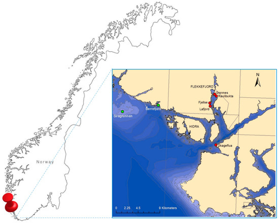 - Green, N.W.; Schøyen, M.; Øxnevad, S.; Ruus, A.; Allan, I.; Hjermann, D.; Severinsen, G.; Høgåsen, T.; Beylich, B.; Håvardstun, J.; et al. Contaminants in Coastal Waters of Norway—2015. In Miljødirektoratet & Norwegian Institute for Water Research; Norwegian Environment Agency: Oslo, Norway, 2016; p. 209. [Google Scholar]