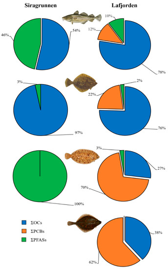 Percentage contribution (%) of organohalogen contaminants in the fillets of four demersal fish species (from the top of the picture: Atlantic cod, European flounder, lemon sole, and European plaice) caught at Siragrunnen (open-sea shoal) and Lafjorden (within Flekkefjord fjord). To calculate the mean for each compound, according to EFSA (2010), we used the LOD value when the level of a specific compound was <LOQ.