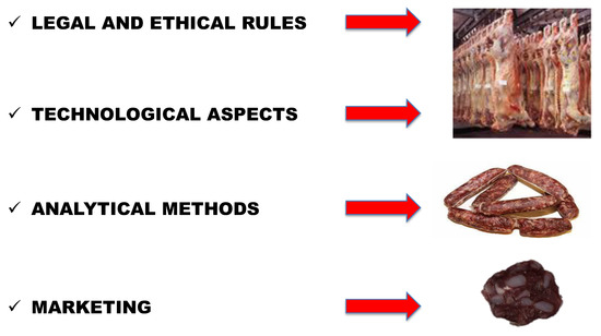 Traditional ḥalāl meat products can be processed in five different ways: salted and/or marinated but not dried, dried not fermented, fermented semidry/dried, smoked, cooked and/or candied [8]. The production and consumption of ḥalāl meat products, as well as ḥalāl salami, obtained through Islamic slaughter rites, have been growing steadily in Europe over recent decades and even the food safety legislation had to consider religious slaughter practices to avoid conflicts [11]. Salami is one of the most representative dry meat products of Mediterranean countries; it involves long ripening periods, with different final quality due, most of all, to their different compositions as the variable ratio of meat and fat, autochthonous or selected microbiota, additives and ingredients, all of them representative of risks to Ḥalāl assurance [12,13]. Figure 1 depicts the most important issues to be considered when ḥalāl salami products are produced (Figure 1).